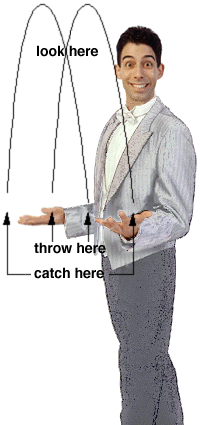 Two balls: almost juggling Now you are ready for two balls. Hold one ball in each hand. Throw one of the balls up and across the same as you just learned. When this first ball starts coming down, then throw the second ball up and across. Each ball should cross over to the opposite hand. Throw, throw, catch, catch. |